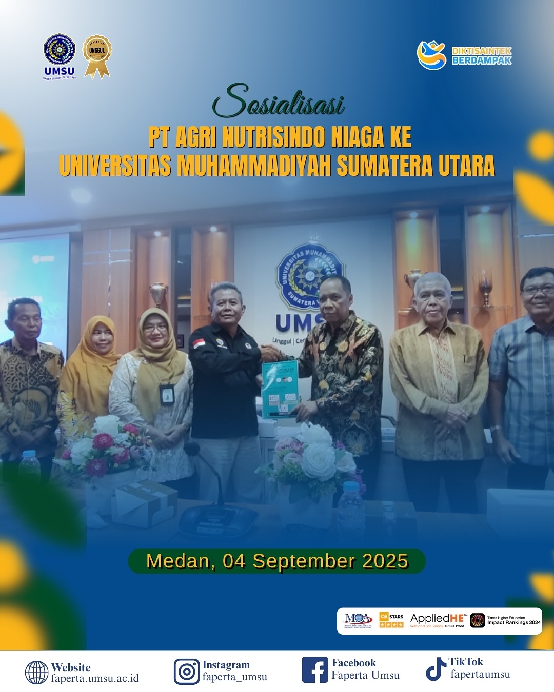 Fakultas Pertanian Universitas Muhammadiyah Sumatera Utara (FAPERTA UMSU) menyambut kunjungan PT Agri Nutrisindo Niaga dalam rangka kegiatan sosialisasi dan penjajakan kolaborasi strategis yang dilaksanakan pada Kamis, 04 September 2025, bertempat di Kampus Universitas Muhammadiyah Sumatera Utara, Medan.
